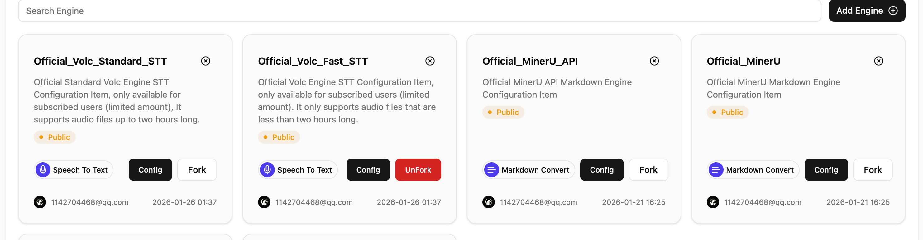 If you want to use someone else’s engine, you must click the Fork button on the engine card, otherwise the system cannot retrieve it. If you no longer want to use it, we recommend un-forking it.