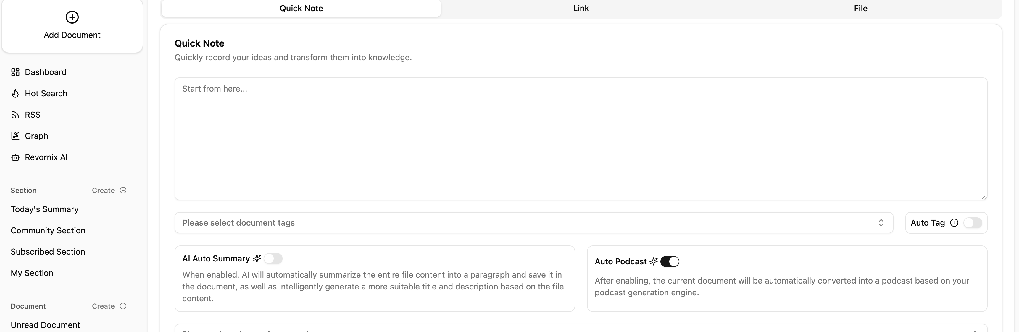 When creating a document, you can choose whether to auto-generate a podcast. If enabled, Revornix will generate a podcast after the document is created. If not, you can generate a podcast manually from the document detail page.